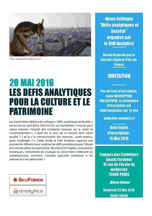 Pour la 4ème édition du Colloque Défis Analytiques et Société, nous nous intéresserons plus particulièrement à l’interface entre Sciences analytiques et Patrimoine. Cette journée est ouverte à tous, membres du DIM ou non, sous réserve d’inscription. Elle se déroulera le 20 mai 2016 aux Cordeliers de 9h à 17h30. Une journée dense à l’image de la richesse du programme. Il s’agit ici de souligner les défis intrinsèques à l’analyse chimique d’une œuvre et à la détermination d’un savoir-faire traditionnel. Quel vernis, quels matériaux sont retenus pour obtenir la sonorité particulière d’un instrument, la couleur d’un pigment ? Comment caractériser les facteurs de dégradation des bâtiments ? Lumière, polluants atmosphériques ou micro-organismes, les acteurs sont nombreux et divers et tous participent à la modification des matériaux. Les domaines d’applications présentés durant la journée sont très divers et montrent que l’innovation dans le domaine de l’analyse chimique peut aider à relever certains défis posés par l’étude des patrimoines matériel et immatériel.